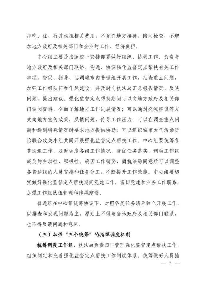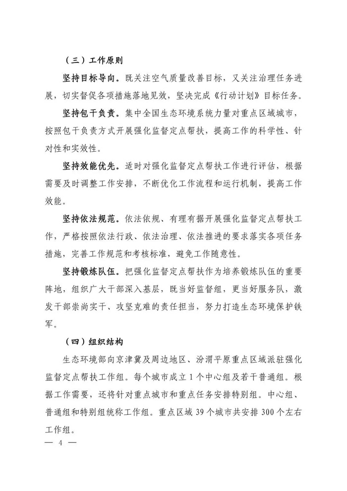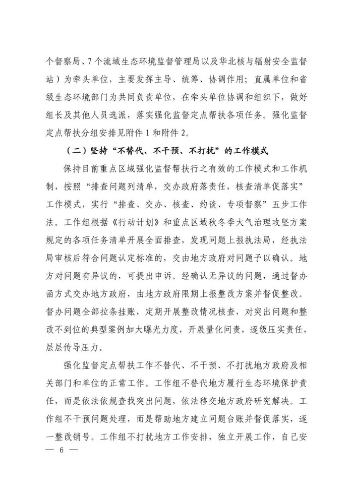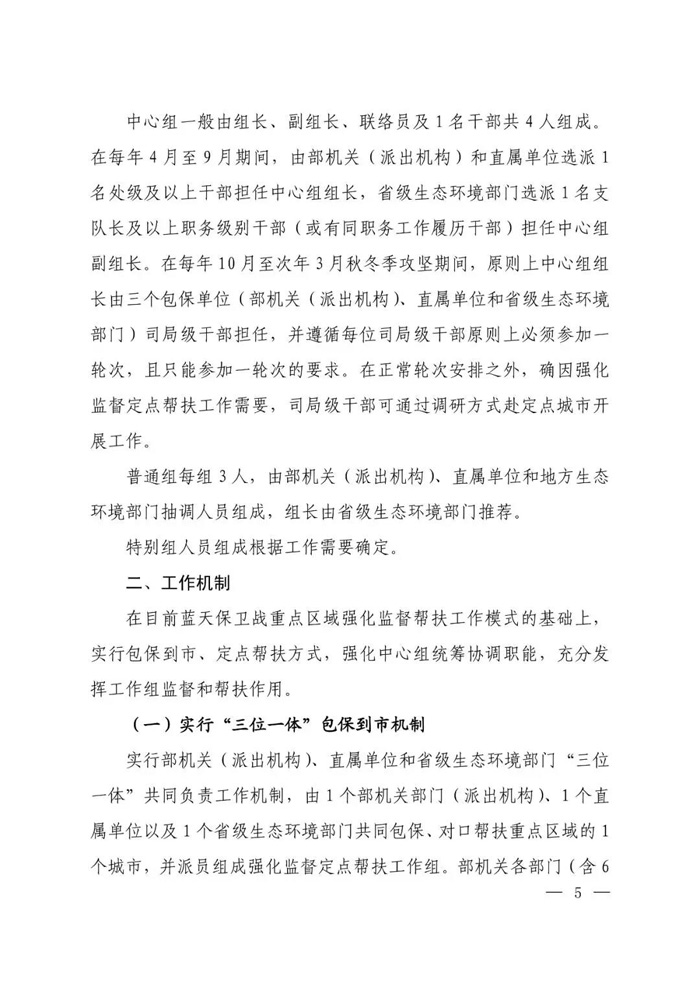 | 5月6日,为贯彻落实党中央、国务院决策部署,坚决打赢蓝天保卫战,生态环境部印发《蓝天保卫战重点区域强化监督定点帮扶工作方案》(以下简称《工作方案》)。 《工作方案》明确了强化监督定点帮扶工作的总体要求、工作机制、工作职责和工作要求。 根据《工作方案》,强化监督定点帮扶工作将从2019年5月起至2021年3月,每15天为一个轮次,压茬交接,持续开展。定点帮扶范围为《打赢蓝天保卫战三年行动计划》确定的京津冀及周边地区、汾渭平原重点区域城市。 由生态环境部向京津冀及周边地区、汾渭平原重点区域派驻强化监督定点帮扶工作组。每个城市成立1个中心组及若干普通组。根据工作需要,还将针对重点城市和重点任务安排特别组。中心组、普通组和特别组统称工作组。重点区域39个城市共安排300个左右工作组。 《工作方案》要求,在目前蓝天保卫战重点区域强化监督帮扶工作模式的基础上,实行包保到市、定点帮扶方式,强化中心组统筹协调职能,充分发挥工作组监督和帮扶作用。 实行部机关(派出机构)、直属单位和省级生态环境部门“三位一体” 共同负责工作机制,由1个部机关部门(派出机构)、1个直属单位以及1个省级生态环境部门共同包保、对口帮扶重点区域的1个城市,并派员组成强化监督定点帮扶工作组。 强化监督定点帮扶工作不替代、不干预、不打扰地方政府及相关部门和单位的正常工作。 还要加强“三个统筹”(统筹调度工作组、统筹协调部内司局、统筹汇总报告和发布情况)的指挥调度机制。 此外,《工作方案》还要求加强政策法规宣贯、开展监督帮扶、培养锻炼队伍。同时提出要统一思想、压实责任、加强保障、强化培训、实施奖惩,并加强作风建设。